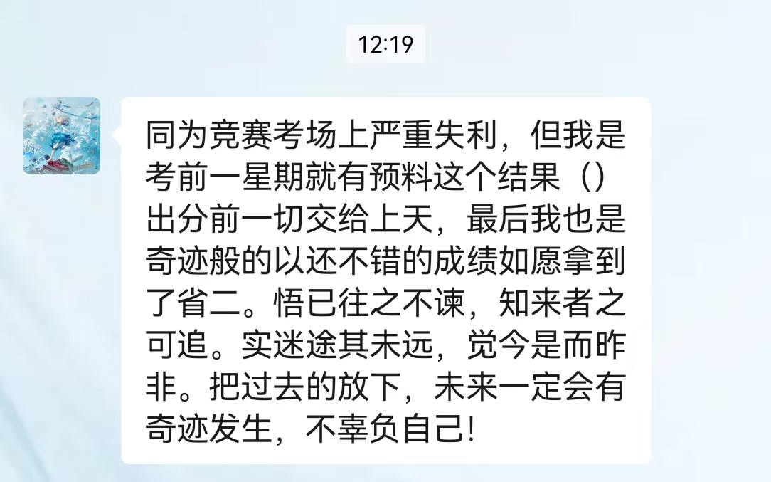 考后心里也没有太崩溃,一直在跟自己说“发生过的事情我们已无法改变,就让它过去吧”,考的也不算特别差吧,还是有概率拿一等奖的。