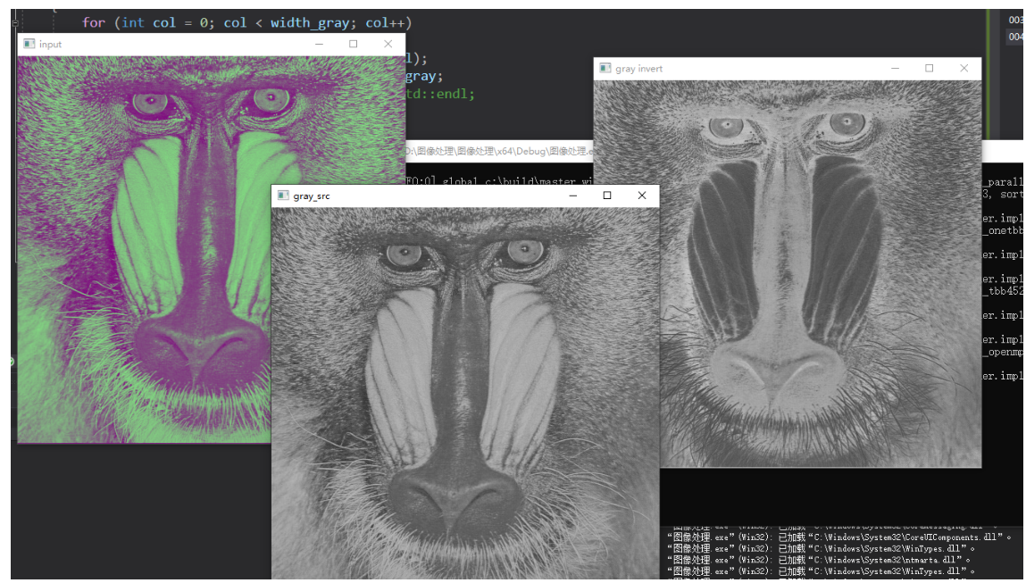 1 #include<opencv2/core/core.hpp> 2 #include<opencv2/opencv.hpp> 3 #include<opencv2/imgcodecs.hpp> 4 #include<opencv2/highgui/highgui.hpp> 5 #include<iostream> 6 7 using namespace cv; 8 using namespace std; 9 10 int main(int argc, char** argv) 11 { 12 Mat src, gray_src; 13 src = imread("C:/Users/aber/Desktop/data/baboon.jpg"); 14 if (!src.data) 15 { 16 cout << "could not load the image..." << endl; 17 return -1; 18 } 19 20 21 int height = src.rows;//高度 22 int width = src.cols;//宽度 23 int channels = src.channels(); 24 cout << ("height=%d width=%d channels=%d", height, width, channels)<< endl; 25 for (int row = 0; row < height; row++) 26 { 27 for (int col = 0; col < width; col++) 28 { 29 if (channels == 3) 30 { 31 src.at<Vec3b>(row, col)[0] = 128;//blue 32 src.at<Vec3b>(row, col)[2] = 128;//red 33 } 34 } 35 } 36 37 cvtColor(src, gray_src, COLOR_BGR2GRAY); 38 namedWindow("gray_src", 1); 39 imshow("gray_src", gray_src); 40 int height_gray = gray_src.rows; 41 int width_gray = gray_src.cols; 42 for (int row = 0; row < height_gray; row++) 43 { 44 for (int col = 0; col < width_gray; col++) 45 { 46 int gray = gray_src.at<uchar>(row, col); 47 gray_src.at<uchar>(row, col) = 255 - gray; 48 //std::cout << ("gray:%d", gray) << std::endl; 49 } 50 } 51 52 imshow("gray invert", gray_src); 53 namedWindow("input", 1); 54 imshow("input", src); 55 waitKey(0); 56 return 0; 57 }