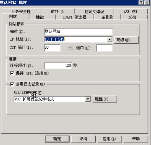 右键“默认网站”,选择“属性”,会出现如下属性对话框,在对话框中IP地址选择为本机IP(一般IP已经存在,不用手工输入),并点击确定。