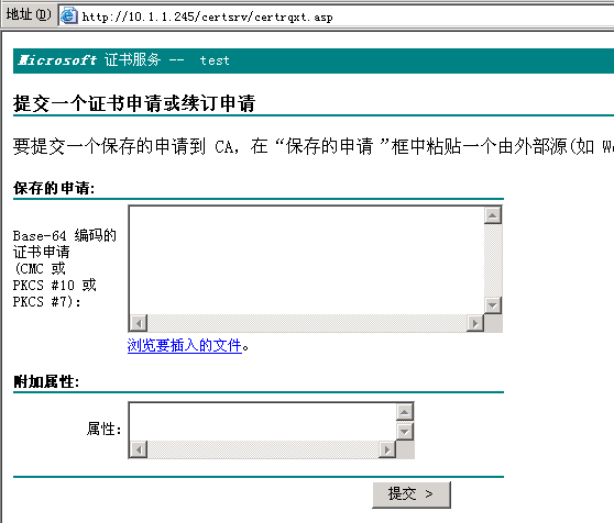 打开浏览器,输入刚才我们搭建的证书服务器地址:Http://10.1.1.245/certsrv/ (在实验中根据自己情况填写IP),在证书服务页面点击“申请一个证书”。