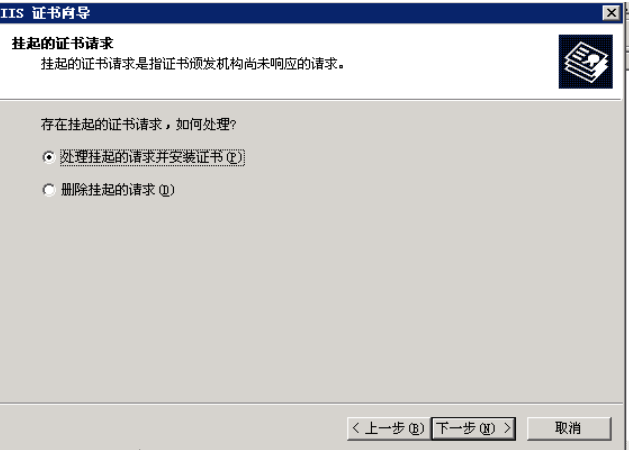 进入Web服务器证书向导,点击下一步, 在“处理挂起请求”中选择“浏览”,选择刚才下载的证书文件,并打开,下一步,使用默认的443端口,点击下一步