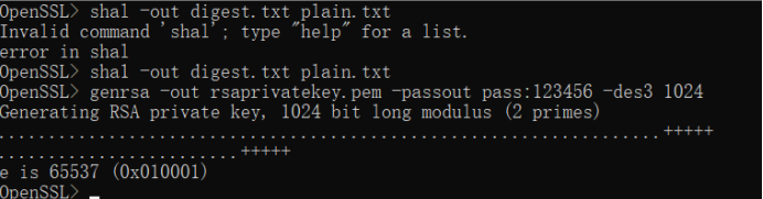 (1)创建1024位的RSA私钥,写入文件rsaprivatekey.pem,同时将私钥用3DES加密,并设置密码。