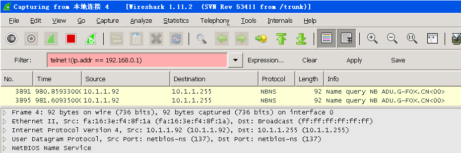 打开Wireshark,在过滤栏中输入Telnet,点击应用。