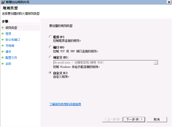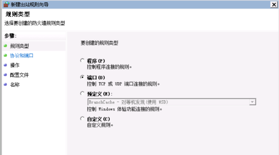2)用户可以创建入站和出站规则,从而阻挡或者允许特定程序或者端口进行连接;可以使用预先设置的规则,也可以创建自定义规则。“新建规则向导”则可以帮用户逐步完成创建规则的步骤。
