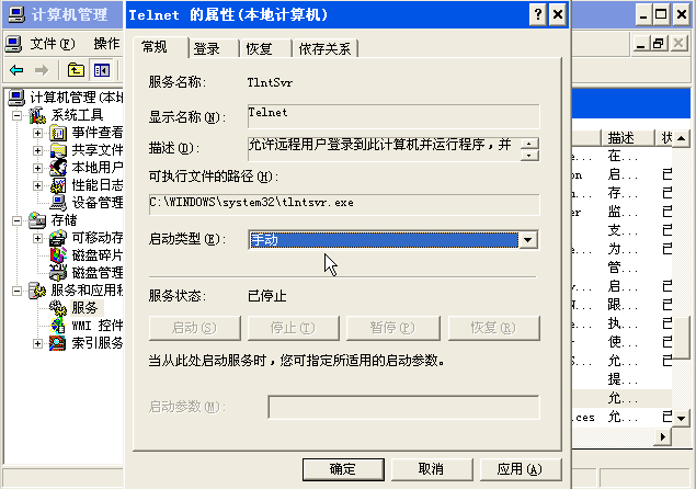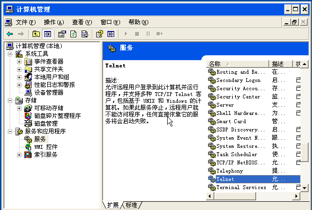 进入主机A,右键“我的电脑”->管理->服务和应用程序->服务,找到Telnet服务,如图所示: