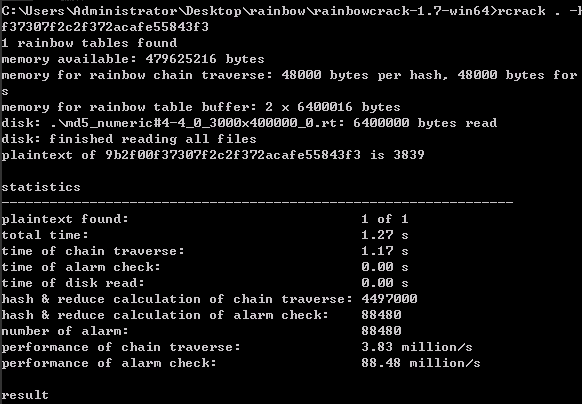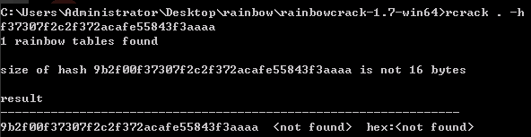 对于单个的哈希值,我们可以直接用rcrack.exe . -h hashnum来进行破解: