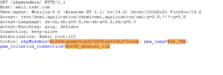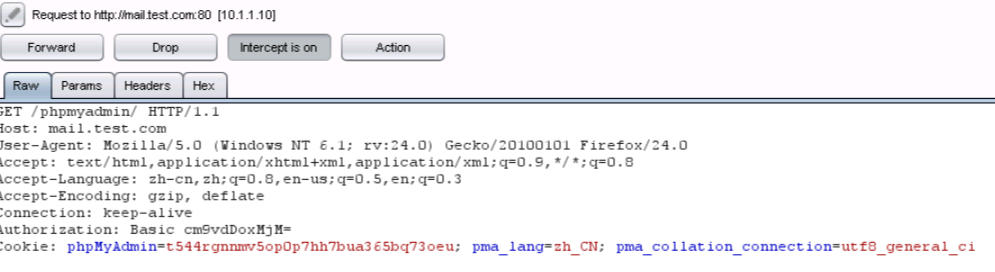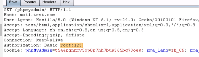 5、接下来对phpmyadmin进行暴力破解,随便输入一个用户名和密码,比如此处我输入:用户名:root 密码:123,页面提示错误,然后查看burpsuite截获到的数据包。