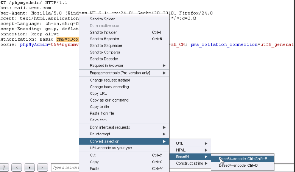 6、找到Authorization,选中Basic后边的字符串,进行如下步骤:右键convert selection->base64->base64-decode。