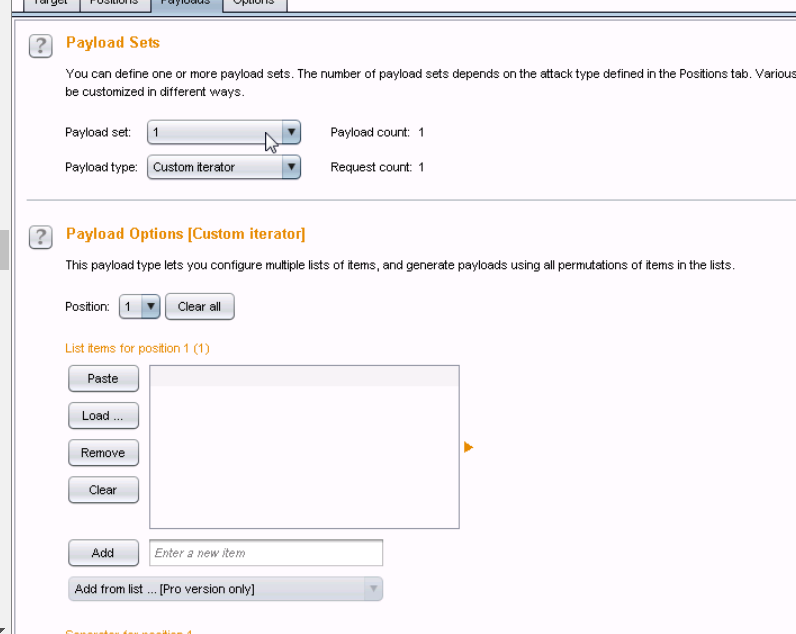10、切换到payloads选项卡下,设置payload type,在add处添加用户名,separator for position1 处添加一个冒号。