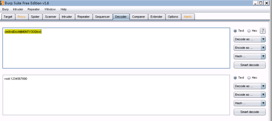 16、粘贴在decoder下,选择decode as base64,可以看到用户名密码为root:1234567890,登录。
