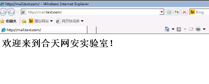 25、刷新 http://mail.test.com,发现劫持成功。页面会显示为:“欢迎来到合天网安实验室!”