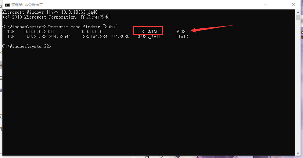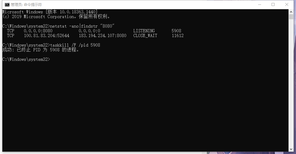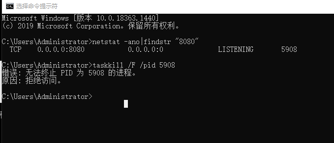 3、找到被占用的进程号,使用命令 taskkill /F /pid 进程号,即可