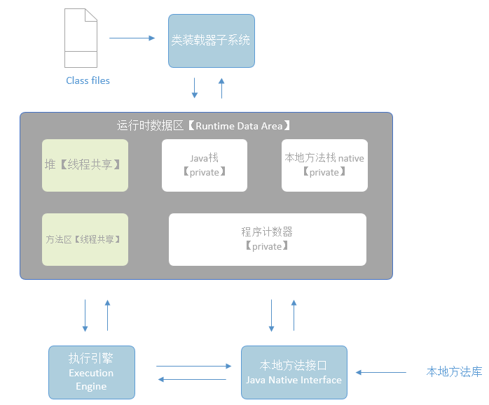 1本地方法栈(线程私有):登记native方法,如调用C语言使用的JNI技术,在Execution Engine执行时加载本地方法库