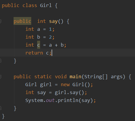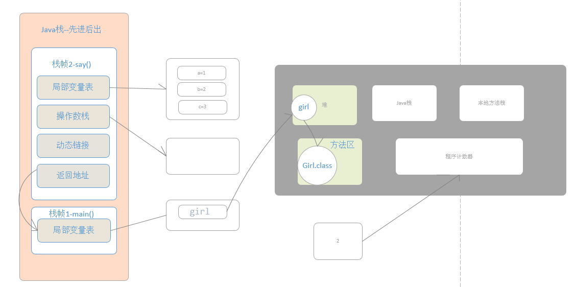 2主线程启动,创建main栈帧入java栈,程序计数器将会记录到下一行要执行到的代码,执行say()方法时将创建say栈帧,将变量存储到操作数栈中(调用istore/iload等指令),执行到c = a + b时候将会执行iadd,然后得到结果为3,栈帧2-say出栈,通过返回地址返回给main栈帧,继续执行完直到退出main栈帧,程序结束。具体指令请详细请参考: https://segmentfault.com/q/1010000008683475