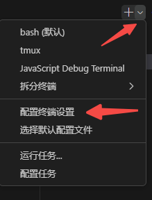 在终端上“+”旁边下箭头处点开后,进入“配置终端设置”,在设置搜索栏输入"terminal.integrated.defaultProfile.Linux" (其他系统改下,如windows),之后在下边选择默认启动哪个“bash”或“tmux”。bash可以直接上翻查看log记录。