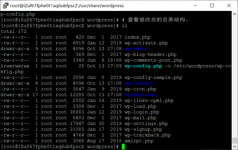 # 进入/usr/share/wordpress目录。 cd /usr/share/wordpress # 修改路径。 ln -snf /etc/wordpress/wp-config.php wp-config.php # 查看修改后的目录结构。 ll
