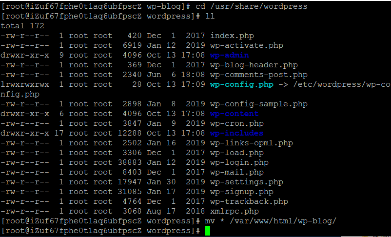 # 在Apache的根目录/var/www/html下,创建一个wp-blog文件夹。 mkdir /var/www/html/wp-blog mv * /var/www/html/wp-blog/