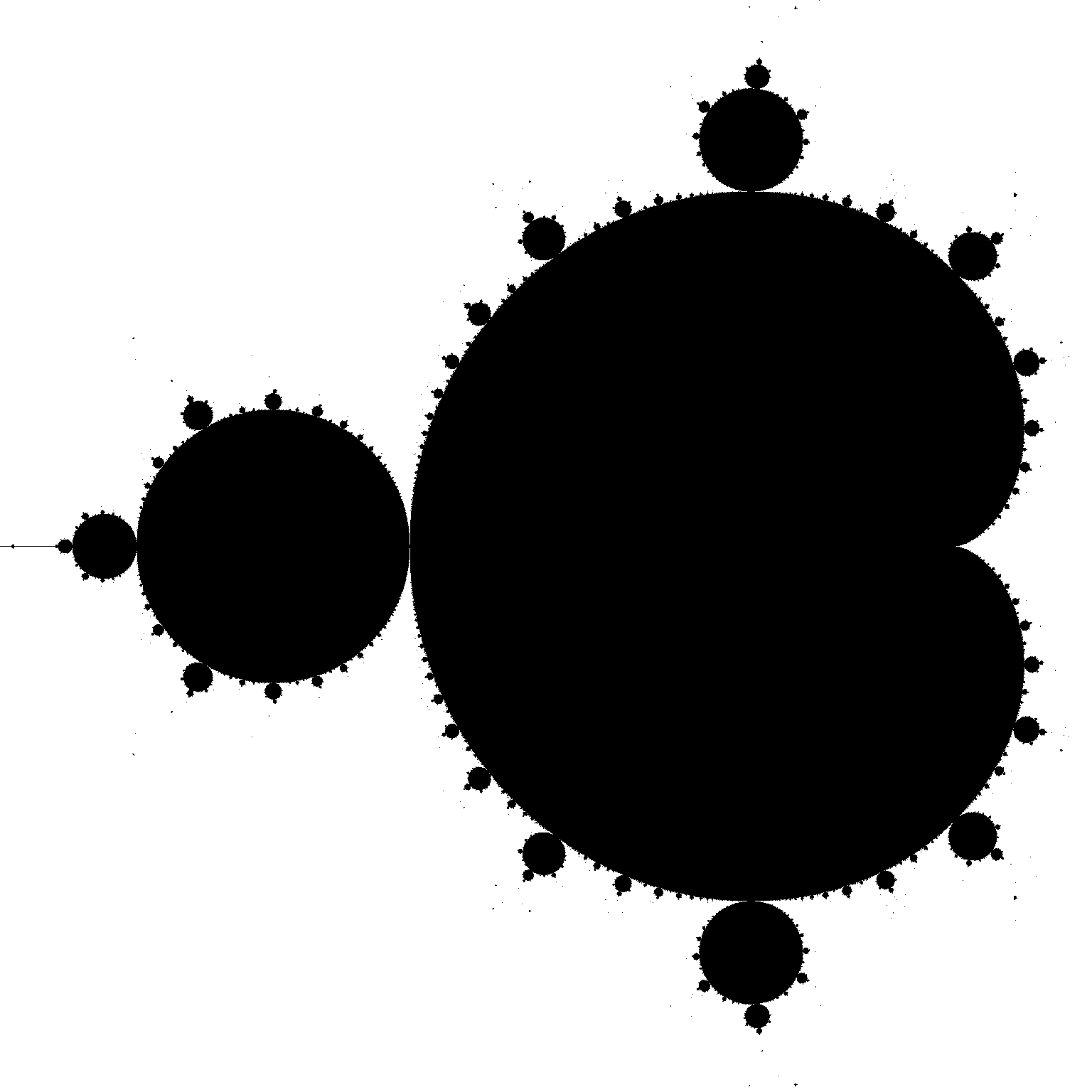 1 #include <stdio.h> 2 #include <stdlib.h> 3 #include <string.h> 4 #include <math.h> 5 #include <complex.h> 6 #include <stdbool.h> 7 8 #define XDIM 1536 //此项必须为8的倍数,否则有BUG 9 #define YDIM 1536 10 11 #define NUM 1000 //迭代次数 12 13 // z = z*z + c 14 15 bool tof_complex(int i, int j) //复数版本 (1536*1536->1000(1 core):15.128s) 16 { 17 int n = NUM; 18 //坐标转换 19 double complex c = (i-0.75*XDIM)/XDIM*2+(j-0.5*YDIM)*2/YDIM*I; 20 double complex z = 0; 21 while(n>0){ 22 z = z*z+c; 23 if(cabs(z)>2) 24 return false; 25 n--; 26 } 27 return true; 28 } 29 30 struct COMPLEX 31 { 32 double re; 33 double im; 34 }; 35 36 bool tof_real(int i,int j) //纯实数版本 (1536*1536->1000(1 core):4.991s) 37 { 38 int n = NUM; 39 struct COMPLEX z = {0,0}; 40 struct COMPLEX c = { 41 (i-0.75*XDIM)/XDIM*2, 42 (j-0.5*YDIM)*2/YDIM 43 }; 44 while(n>0){ 45 double z_re_bak = z.re; 46 z.re = z.re*z.re-z.im*z.im+c.re; 47 z.im = 2*z_re_bak*z.im+c.im; 48 if(z.re>2||z.im>2) 49 return false; 50 n--; 51 } 52 return true; 53 } 54 55 void writeBit(bool bit, FILE * fp) 56 { 57 static int bitNum = 0; 58 static unsigned char Byte = 0; 59 if(bitNum==8) 60 { 61 fputc(Byte, fp); 62 Byte = 0; 63 bitNum = 0; 64 } 65 Byte ^= bit<<(7-bitNum); 66 bitNum++; 67 } 68 69 int main() 70 { 71 FILE *fp; 72 fp = fopen("picture.pbm","wb"); 73 fprintf(fp, "P4 %d %d\n", XDIM, YDIM); 74 for(int j=0; j<YDIM; j++) 75 for(int i=0; i<XDIM; i++) 76 writeBit(tof_complex(i, j), fp); 77 fclose(fp); 78 return 0; 79 }