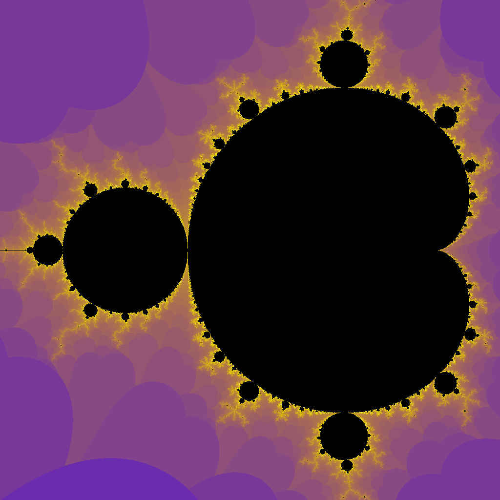 1 #include <stdio.h> 2 #include <stdlib.h> 3 #include <string.h> 4 #include <math.h> 5 #include <complex.h> 6 #include <stdbool.h> 7 8 #define XDIM 1024 9 #define YDIM 1024 10 11 #define NUM 512 //迭代次数 12 13 // z = z*z + c 14 15 bool tof_complex(int i, int j) 16 { 17 double complex c = (i-0.75*XDIM)/XDIM*2+(j-0.5*YDIM)*2/YDIM*I; 18 double complex z = 0; 19 for(int t=1;t<=NUM;t++){ 20 z = z*z+c; 21 if(cabs(z)>2) 22 return t; 23 } 24 return 0; 25 } 26 27 struct COMPLEX 28 { 29 double re; 30 double im; 31 }; 32 33 int tof_real(int i, int j) 34 { 35 struct COMPLEX z = {0,0}; 36 struct COMPLEX c = { 37 (i-0.75*XDIM)/XDIM*2, 38 (j-0.5*YDIM)*2/YDIM 39 }; 40 for(int t=1;t<=NUM;t++){ 41 double z_re_bak = z.re; 42 z.re = z.re*z.re-z.im*z.im+c.re; 43 z.im = 2*z_re_bak*z.im+c.im; 44 if(z.re>2||z.im>2) 45 return t; 46 } 47 return 0; 48 } 49 50 struct RGB 51 { 52 unsigned char R; 53 unsigned char G; 54 unsigned char B; 55 }; 56 57 struct RGB translate2RGB(int code) //code: 0 - 511 58 { 59 struct RGB ret = {0, 0, 0};//返回局部变量,危险 60 if(code){ 61 ret.R = (int)(sqrt((double)code/NUM)*256); 62 ret.G = (int)(((double)code/NUM*(1.0-(double)code/NUM))*NUM); 63 ret.B = (int)(pow((1.0-(double)code/NUM), 108)*256); 64 } 65 return ret; 66 } 67 68 int main() 69 { 70 FILE *fp = fopen("out.ppm", "wb"); 71 fprintf(fp, "P6\n%d %d\n255\n", XDIM, YDIM); 72 for(int j=0;j<YDIM;j++) 73 for(int i=0;i<XDIM;i++) 74 { 75 struct RGB tof_ret = translate2RGB(tof_real(i, j)); 76 fprintf(fp, "%c%c%c", tof_ret.R, tof_ret.G, tof_ret.B); 77 } 78 79 fclose(fp); 80 return 0; 81 }