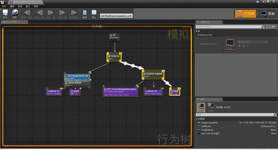 在播放游戏前,重新调整玩家的位置让它不会立刻被AI发现。开始游戏后,在内容浏览器中打开行为树,找到工作栏中的下拉菜单,它当前显示“没有选中调试对象“,点击它并选中”AIC Third PersonCharacter“,现在我们可以看到行为树的执行流程。
