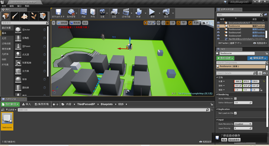 我们的AI现在可以使用感知系统找到玩家并向他们靠近。下一步我们需要让AI将多种环境因素考虑在内。对于这种复杂情况,我们需要用到环境查询系统。我们先从创建一个AI感兴趣的对象——一个食物来源Actor,把它布置在关卡,然后我们会启用EQS系统并创建一个EQS查询来帮助AI定位关卡内的食物来源。我们从新建食物来源开始。在蓝图目录中新建一个目录,将它命名为”EQS”,打开目录,右键点击内容浏览器,选择“蓝图类“,然后选择”Actor“,命名为”foodsource“。双击食物来源,打开蓝图编辑器,找到左边的组件面板,点击”添加组件“按钮,选择立方体,为蓝图添加立方体组件。在组件面板中选中立方体组件,找到细节面板中的”碰撞“分段,其中”碰撞预设“下拉菜单将它从默认设置改为”无碰撞“,这么做是为了避免这个对象的碰撞对导航网格体产生干扰进而影响AI的运动。接着把立方体相对于根节点的Z坐标设置成正70,这将有助于我们把它直接放到关卡地面上,修改完成后,我们编译并保存蓝图。