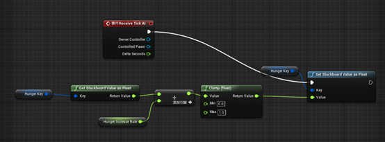 为此,我们首先会新建一个黑板键,用来保存饥饿值,然后通过服务对其进行操作,首先打开当前的行为树,在右侧打开黑板,在黑板中添加一个浮点类型的黑板键,并命名为“hungerKey“。添加新键后,在右上角选择”行为树“,现在我们添加一个服务,点击工具栏中的”服务“按钮,这样会自动新建服务并打开编辑器,回到内容浏览器将之命名为”BTS_Hunger“,在我的蓝图面板新建一个变量,将它命名为”HungerKey”,把变量类型设置为”key“,确保它是公共变量所以其他行为书中可修改它。现在在事件图表中添加一个”tick”事件,每当行为树中的服务更新时,这个事件都会触发,右键点击事件表,选择”Event Recevie Tick AI“,现在我们需要从创建的”HungerKey“中获取一些信息。按住Ctrl键和左键,将”变量“分段中的“hungerKey“拖动到事件图表,拖动”HungerKey“然后输入”get Blackboard value as float“。现在我们要做的是让饥饿值与浮点数相加用于表示在这一帧中饥饿发生了变化,拖动”get Blackboard value as float“的返回值搜索”float+float“的第二个输入,将它提升至变量,把这个变量命名为”Hunger increase Rate“,确保它也是公共变量。这样每当服务更新时,”Hunger Increase Rate“都会与当前的饥饿值相加。我们要让饥饿值介于0和1的范围之间,我们可以通过限制函数来实现这点,拖动”float+float“节点,然后输入”clamp float“,限制函数会获取输入值,然后根据函数定义中的最小值和最大值返回结果。现在要将新的饥饿值保存到黑板中,在事件图表中选中”Hunger Key“,复制后拖动并选择”set blackboardvalueasfloat“。现在拖动限制函数的返回值连上”set Blackboard value as float“的输入值。最后要做的是将”Tick AI“事件的执行引脚连到”set Blackboard value as float“,编译并关闭。