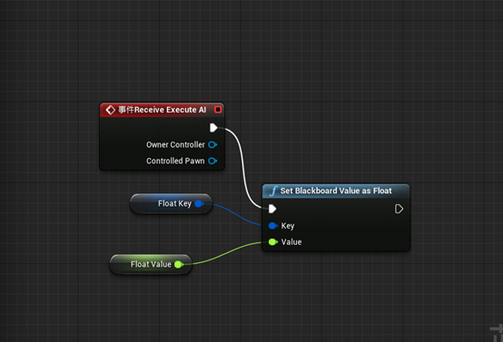 接下来,右键点击事件图表,然后输入“Event Receive Execute AI“,我们要用变量将黑板键设置成需要的值,按住Ctrl键,将” FloatKey “拖动到主窗口,拖动其引脚,找到”set Blackboard value as float“。现在将”FloatValue“连到”set Blackboard value as float“的数值输入,按住Ctrl键,将”FloatValue“拖动到主窗口,将浮点数值连到”set Blackboard value as float“的数值输入,现在我们可以将事件的执行引脚连到函数上。