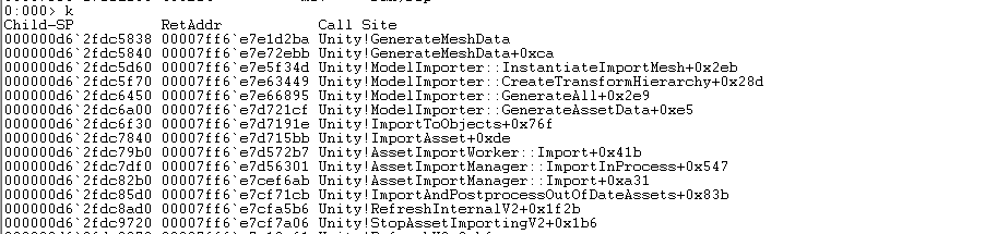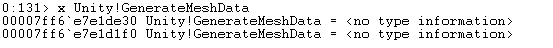 - WinDb输入要查询的函数(这里以GenerateMeshData举例): x Unity!GenerateMeshData