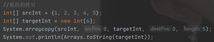 1.1、数组的拷贝:arraycopy(Object src, int srcPos, Object dest, int destPos, int length),src参数为源数组,srcPos参数为源数组起始位置,dest参数为目标数组,destPos参数为目标数组起始位置,length参数为要复制的数组元素的数量