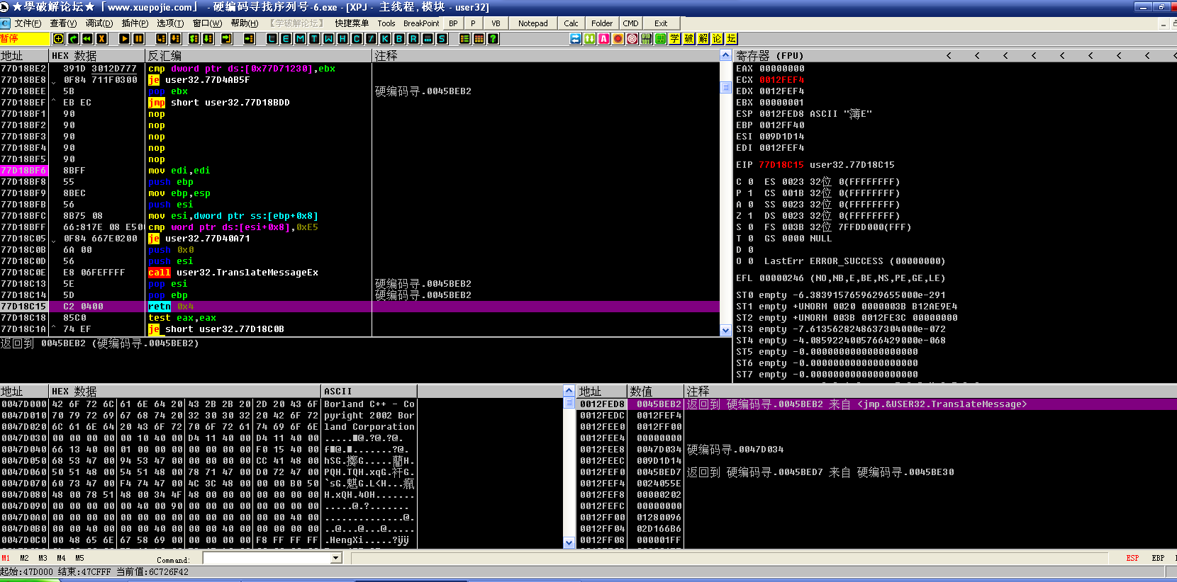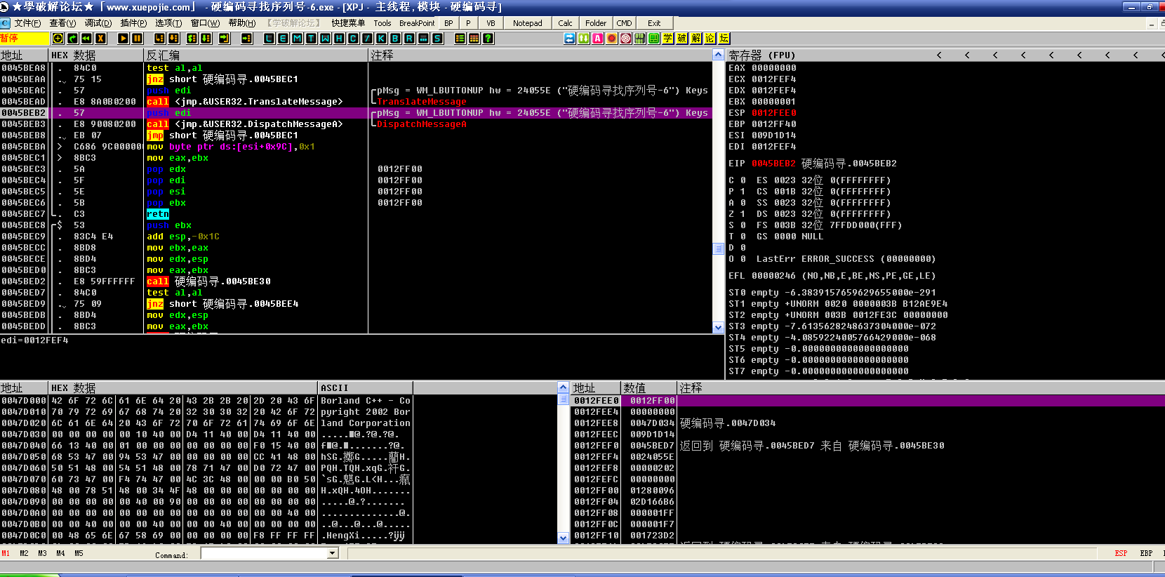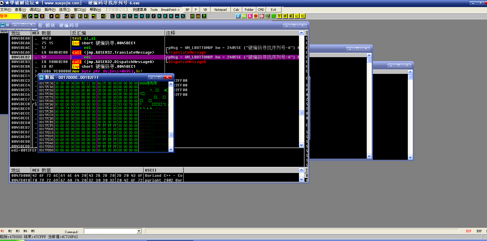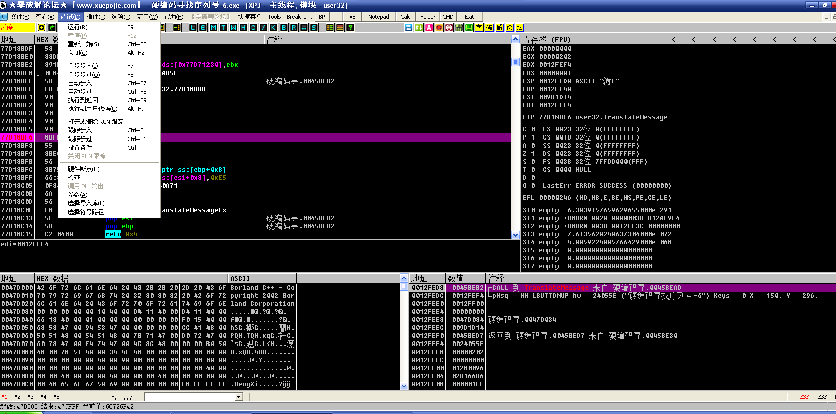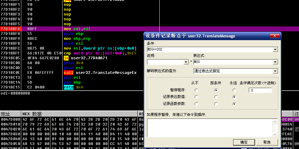 - 当其他api函数找不到的时候,或者说api函数下断点无效的时候,可以使用TranslateMesage 进行下断.