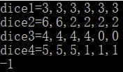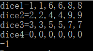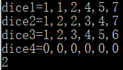 1 #include<stdio.h> 2 int compare(int a[],int b[]) 3 { 4 int m=0,n=0,i,j; 5 for(i=0;i<6;i++) 6 { 7 for(j=0;j<6;j++) 8 { 9 if(a[i]<b[j]) 10 { 11 m++; 12 } 13 else if(a[i]>b[j]) 14 { 15 n++; 16 } 17 } 18 } 19 if(m<n) 20 { 21 return 0; 22 } 23 if(m>n) 24 { 25 return 1; 26 } 27 else 28 { 29 return 2; 30 } 31 } 32 int main() 33 { 34 int a[6],b[6],c[6],d[6]; 35 printf("dice1="); 36 scanf("%d,%d,%d,%d,%d,%d",&a[0],&a[1],&a[2],&a[3],&a[4],&a[5]); 37 printf("dice2="); 38 scanf("%d,%d,%d,%d,%d,%d",&b[0],&b[1],&b[2],&b[3],&b[4],&b[5]); 39 printf("dice3="); 40 scanf("%d,%d,%d,%d,%d,%d",&c[0],&c[1],&c[2],&c[3],&c[4],&c[5]); 41 printf("dice4="); 42 scanf("%d,%d,%d,%d,%d,%d",&d[0],&d[1],&d[2],&d[3],&d[4],&d[5]); 43 int m,n,o,p,q,r; 44 m=compare(a,b); 45 n=compare(a,c); 46 o=compare(a,d); 47 p=compare(b,c); 48 q=compare(b,d); 49 r=compare(c,d); 50 if(m==0&&n==0&&o==0) 51 { 52 printf("0\n"); 53 } 54 else if(m==1&&p==0&&q==0) 55 { 56 printf("1\n"); 57 } 58 else if(n==1&&p==1&&q==0) 59 { 60 printf("2\n"); 61 } 62 else if(o==1&&q==1&&r==1) 63 { 64 printf("3\n"); 65 } 66 else 67 { 68 printf("-1\n"); 69 } 70 return 0; 71 }