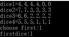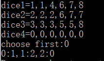 1 #include<stdio.h> 2 int compare(int a[],int b[]) 3 { 4 int m=0,n=0,i,j; 5 for(i=0;i<6;i++) 6 { 7 for(j=0;j<6;j++) 8 { 9 if(a[i]<b[j]) 10 { 11 m++; 12 } 13 else if(a[i]>b[j]) 14 { 15 n++; 16 } 17 } 18 } 19 if(m<n) 20 { 21 return 0; 22 } 23 if(m>n) 24 { 25 return 1; 26 } 27 else 28 { 29 return 2; 30 } 31 } 32 int main() 33 { 34 int a[6],b[6],c[6],d[6],e,f; 35 printf("dice1="); 36 scanf("%d,%d,%d,%d,%d,%d",&a[0],&a[1],&a[2],&a[3],&a[4],&a[5]); 37 printf("dice2="); 38 scanf("%d,%d,%d,%d,%d,%d",&b[0],&b[1],&b[2],&b[3],&b[4],&b[5]); 39 printf("dice3="); 40 scanf("%d,%d,%d,%d,%d,%d",&c[0],&c[1],&c[2],&c[3],&c[4],&c[5]); 41 printf("dice4="); 42 scanf("%d,%d,%d,%d,%d,%d",&d[0],&d[1],&d[2],&d[3],&d[4],&d[5]); 43 printf("choose first:"); 44 scanf("%d",&e); 45 switch(e) 46 { 47 case 1: 48 { 49 int m,n,o,p,q,r; 50 m=compare(a,b); 51 n=compare(a,c); 52 o=compare(a,d); 53 p=compare(b,c); 54 q=compare(b,d); 55 r=compare(c,d); 56 if(m==0&&n==0&&o==0) 57 { 58 printf("firstdice:0\n"); 59 } 60 else if(m==1&&p==0&&q==0) 61 { 62 printf("firstdice:1\n"); 63 } 64 else if(n==1&&p==1&&q==0) 65 { 66 printf("firstdice:2\n"); 67 } 68 else if(o==1&&q==1&&r==1) 69 { 70 printf("firstdice:3\n"); 71 } 72 else 73 { 74 printf("firstdice:-1\n"); 75 } 76 break; 77 } 78 case 0: 79 { 80 printf("0:"); 81 f=compare(a,b); 82 if(f==1) 83 { 84 printf("1"); 85 } 86 f=compare(a,c); 87 if(f==1) 88 { 89 printf("2"); 90 } 91 printf(","); 92 printf("1:"); 93 f=compare(b,c); 94 if(f==1) 95 { 96 printf("2"); 97 } 98 f=compare(b,a); 99 if(f==1) 100 { 101 printf("0"); 102 } 103 printf(","); 104 printf("2:"); 105 f=compare(c,a); 106 if(f==1) 107 { 108 printf("0"); 109 } 110 f=compare(c,b); 111 if(f==1) 112 { 113 printf("1"); 114 } 115 printf("\n"); 116 break; 117 } 118 default:break; 119 } 120 return 0; 121 }