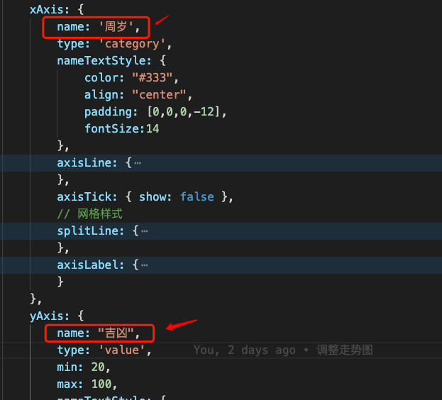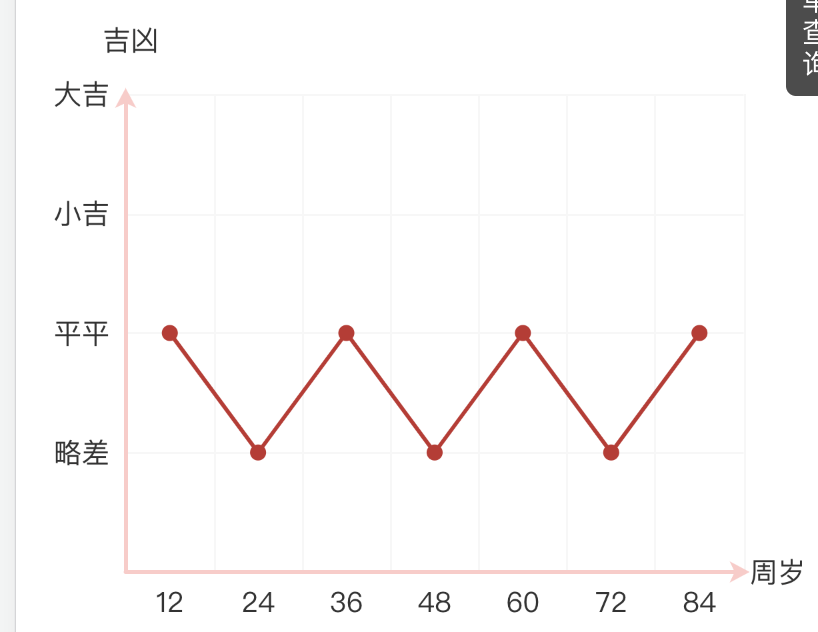 // 走势图 var chart = function() { if($('#resultChart').length){ var chartdata = $('#resultChart').data('source'); var source = []; for(var key in chartdata){ source.push({age: chartdata[key].age, value: chartdata[key].fen}) } require(['ffsm-echarts'], function(echarts) { var myChart = echarts.init($('#resultChart').get(0)); var option = { // 图标位置设置 grid:{ top: 50, bottom: 20, left: '2%', // 与容器左侧的距离 right: '10%', // 与容器右侧的距离 containLabel:true }, xAxis: { name: '周岁', type: 'category', nameTextStyle: { color: "#333", align: "center", padding: [0,0,0,-12], fontSize:14 }, axisLine: { symbol:['none','arrow'], symbolSize: [8, 10], symbolOffset: [0, 3], lineStyle: { color: "#ffcac8", width: 2 } }, axisTick: { show: false }, // 网格样式 splitLine: { show: true, lineStyle:{ color: ['#f7f7f7'], width: 1, type: 'solid' } }, axisLabel: { color: "#333", // margin: 2, fontSize:14, } }, yAxis: { name: "吉凶", type: 'value', min: 20, max: 100, nameTextStyle: { color: "#333", // backgroundColor: "#de2323", fontSize: 14, padding: [0,0,5,5], }, axisLine:{ symbol:['none','arrow'], symbolSize: [8, 10], symbolOffset: [0, 3], lineStyle:{ color:'#ffcac8', width:2, } }, axisTick : {show: false}, // 网格样式 splitLine: { show: true, lineStyle:{ color: ['#f7f7f7'], width: 1, type: 'solid' } }, axisLabel:{ //修改y轴的数据 color: '#333', fontSize:14, formatter: function (value) { var texts = []; if(value==20){ texts.push(''); }else if (value>20 && value<=40) { texts.push('略差'); }else if (value>40 && value<=60) { texts.push('平平'); }else if(value>60 && value<=80){ texts.push('小吉'); }else if(value>80 && value<=100){ texts.push('大吉'); } return texts; } }, }, series: [{ type: 'line', smooth: false,//true 为平滑曲线,false为直线 lineStyle: { width: 2 }, encode: { x: 'age', y: 'value' }, itemStyle : { normal : { // 设置折线折点颜色 color:'#c3312f', // 设置折线线条颜色 lineStyle:{ color:'#c3312f' } } }, symbol: 'circle', //设定为实心点 symbolSize: 8, //设定实心点的大小 }], dataset: { dimensions: ['age', 'value'], source: source } }; myChart.setOption(option); $(window).resize(function() {myChart.resize();}); }); } }();
