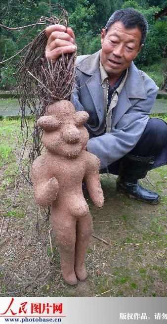 人民网讯 2009年10月27日上午,四川阆中市江南镇大田坝村63岁的老农郑德训向记者展示了他5天前挖出的一株酷似人形的何首乌。
