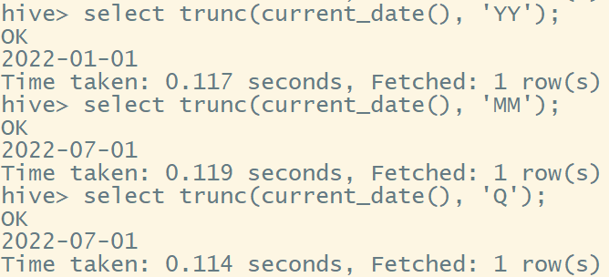 select trunc(current_date(), 'Q'); -- 返回当季第一天日期
