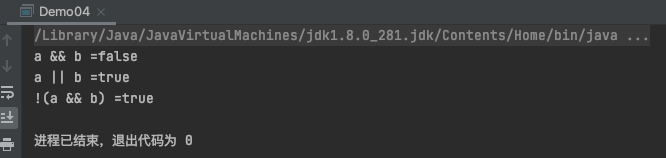 System.out.println("!(a && b) =" + !(a && b));