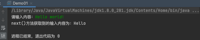 import java.util.Scanner; public class Demo01 { public static void main(String[] args) { //实例化对象 获取用户输入 Scanner s = new Scanner(System.in); System.out.print("请输入内容:"); String str = s.next(); //等待用户输入,并接收输入的数据 System.out.println("next()方法获取到的输入内容为:"+str); s.close(); //IO类使用完要及时关闭,避免占用资源。 } }结果: