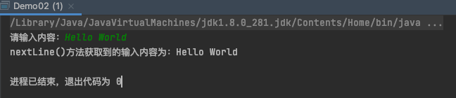 import java.util.Scanner; public class Demo02 { public static void main(String[] args) { //实例化对象 获取用户输入 Scanner s = new Scanner(System.in); System.out.print("请输入内容:"); String str = s.nextLine(); //等待用户输入,并接收输入的数据 System.out.println("nextLine()方法获取到的输入内容为:"+str); s.close(); //IO类使用完要及时关闭,避免占用资源。 } }结果: