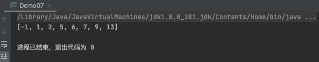 import java.util.Arrays; public class Demo07 { public static void main(String[] args) { int[] a = {1,2,6,9,-1,5,7,13}; int[] b = sort(a); System.out.println(Arrays.toString(b)); } public static int[] sort(int[] a) { int temp = 0; //外层循环判断次数 for (int i = 0; i < a.length-1; i++) { //内层循环,比较相邻两个数,如果第一个数比第二个数大,则交换位置 for (int j = 0; j < a.length-1-i; j++) { if (a[j] > a[j+1]) { temp = a[j+1]; a[j+1] = a[j]; a[j] = temp; } } } return a; } }排序后结果: