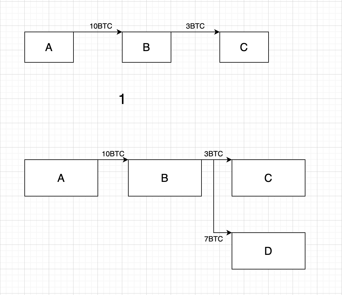 如图,B收到A的10个BTC,他想要给C3个BTC,如果按照1中方式,其余7个比特币会以交易费的形式给挖出区块的矿工。因此,为了避免这种情况,便吸引采用2中方式,将3个BTC转给C,将剩余7个BTC转到自己的另一账户D上面。