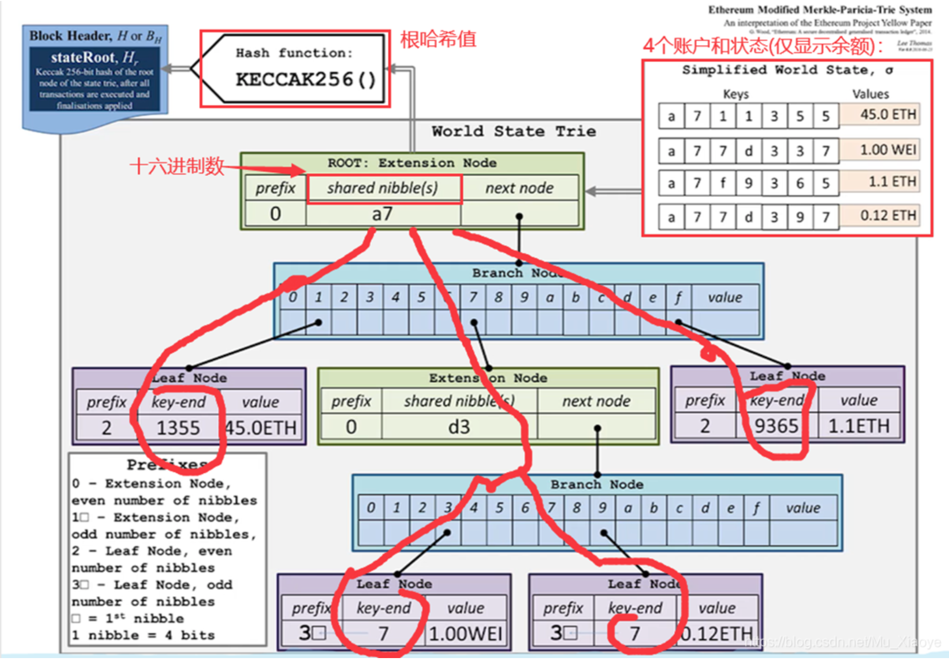 下图为以太坊中使用的MPT结构示意图。右上角表示四个账户(为直观,显示较少)和其状态(只显示账户余额)。(需要注意这里的指针都是哈希指针)