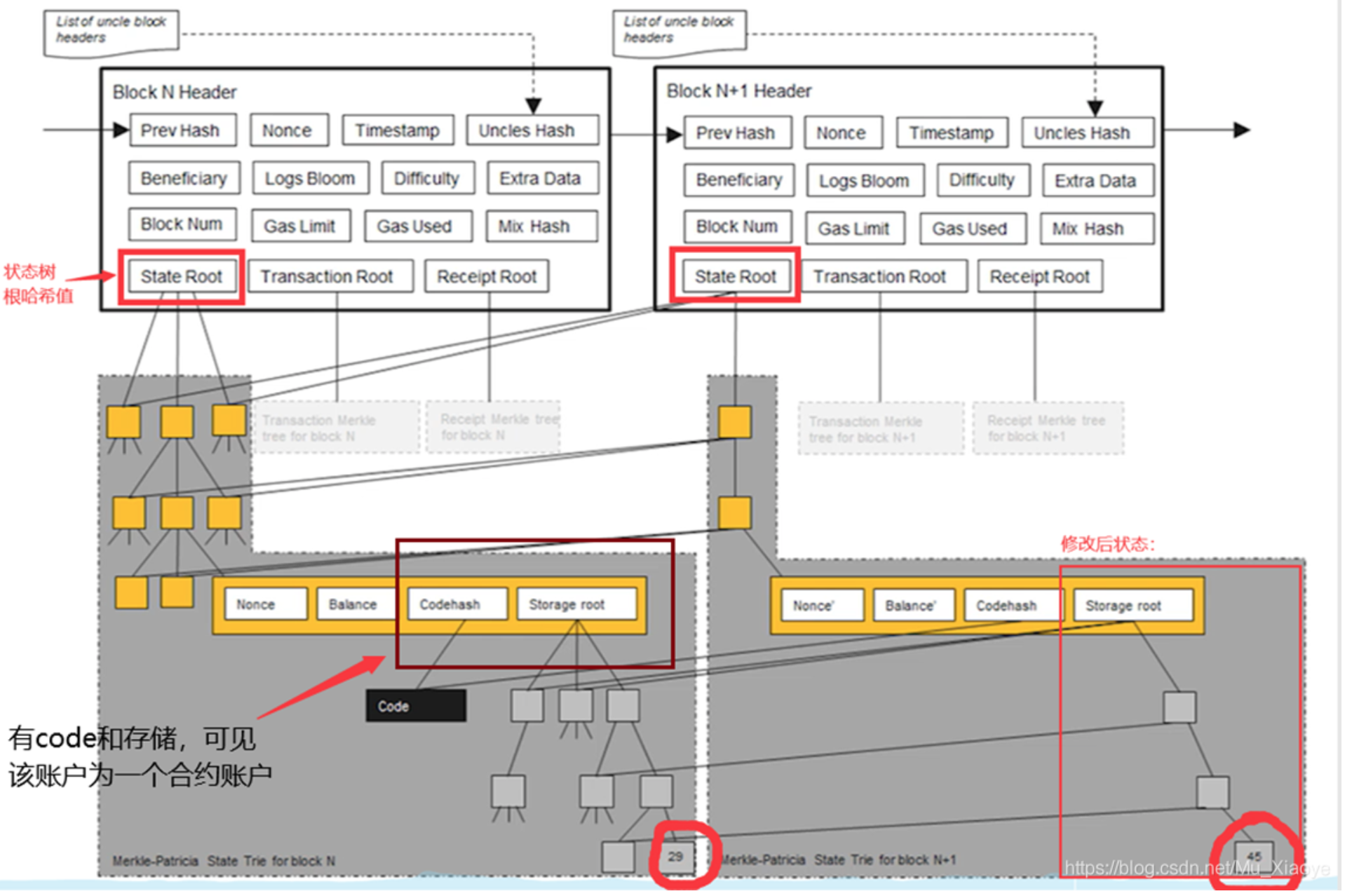 所以,以太坊系统中可如此,将所有账户组织为一个经过路径压缩和排序的Merkle Tree,其根哈希值存储于block header中。BTC系统中只有一个交易组成的Merkle Tree,而以太坊中有三个(三棵树)。也就是说,在以太坊的block header中,存在有三个根哈希值。