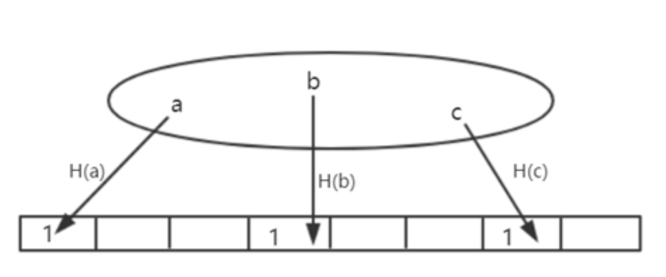 例:如下图,给定一个数据集,其中含义元素a、b、c,通过一个哈希函数H()对其进行计算,将其映射到一个其初始全为0的128位的向量的某个位置,将该位置为1。将所有元素处理完,就可以得到一个向量,则称该向量为原集合的“摘要”。可见该“摘要”比原集合是要小很多的。