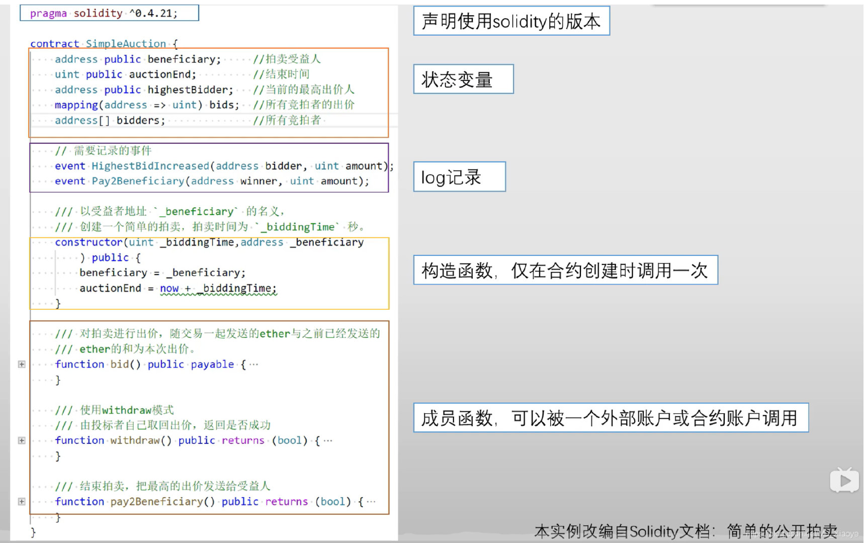 这是一个网上拍卖的合约,这个例子中的bid函数是用来竞拍出价的,比如说要参与拍卖,要出100个以太币,那么就调用合约中的bid函数。所以拍卖的规则是调用bid函数的时候要把拍卖的出价即100个以太币也发送过去存储在合约里,锁定那里一直到拍卖结束。避免有人凭空出价(实际上没有那么多钱,漫天喊价),所以拍卖的时候要把出的价钱发在智能合约里锁定起来。所以这个bid函数要有能够接受外部转账的能力,所以才标注了payable。