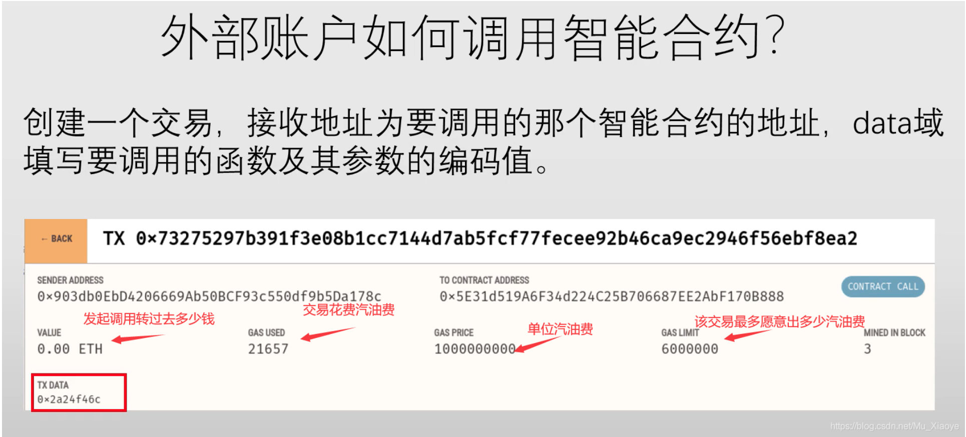 调用智能合约和转账类似,A-B转账,如果B是个普通账户,那么这只是一个普通的转账交易,和BTC的转账交易是一样的,如果B是合约账户的话,那么这个转账其实是发起一次对B的合约的调用,具体调用的是合约中的哪个函数是在数据域(data域)中另外说明的。send address是发起调用的账户地址,To Contract Address是被调用的合约的地址,调用的函数是TXdata里面给出的要调用函数,如果这个函数有参数,那么其参数也在这里的data域里说明的,上面的案例的三个成员函数都是没有参数的,但是有一些成员函数是有参数的。中间一行是调用的参数,Value是发起调用的时候转账花的钱数,这里是0,说明这里只是想调用函数并不想真的转账,所以这里的To contract address函数不需要定义payable。Gas used是这个交易所花的汽油费,gas priced 是单位汽油的价格,gas limit是这比交易愿意支付的最多汽油。