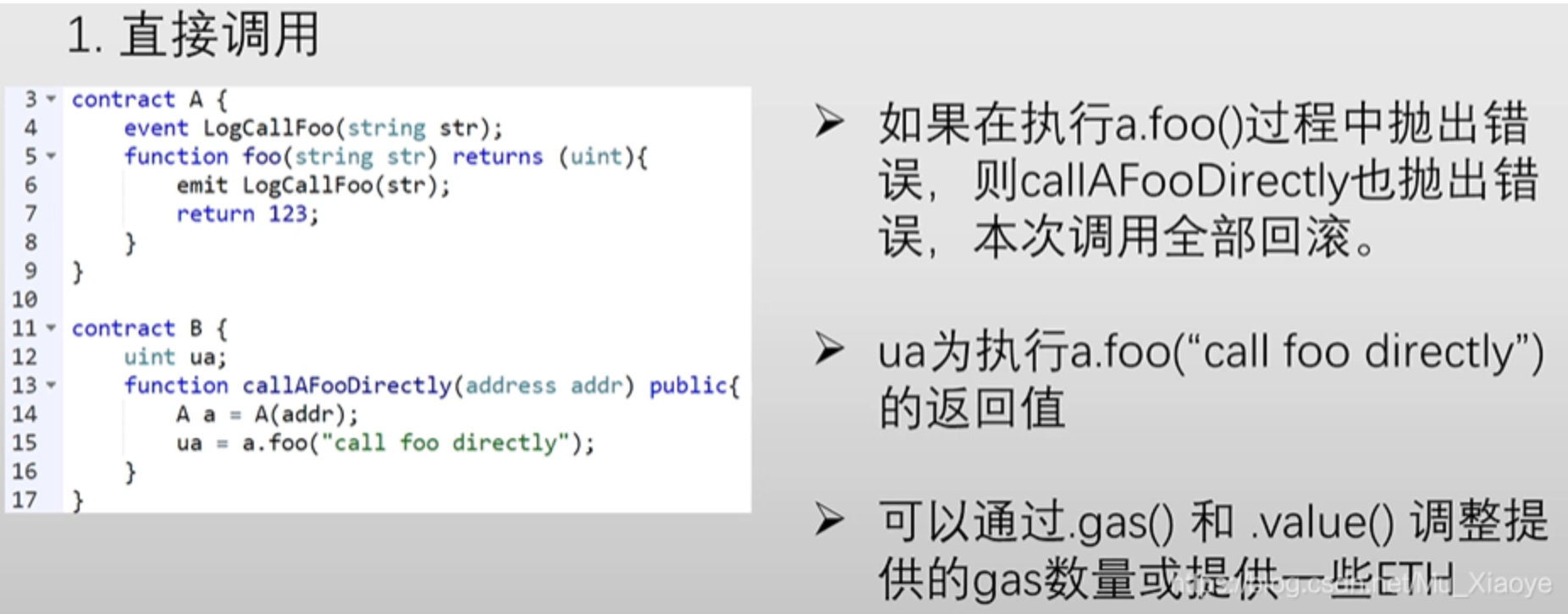 - 直接调用方法,合约A和合约B,A合约就只是写成Log(日志),event是定义一个事件,叫LogCallFoo,emit 来调用这个事件,emit的作用就是写一个log,对于程序运行没有影响;B合约参数是一个地址,就是A合约的地址,然后这个语句把这个地址转换成A这个合约的一个实例,然后调用foo这个函数。