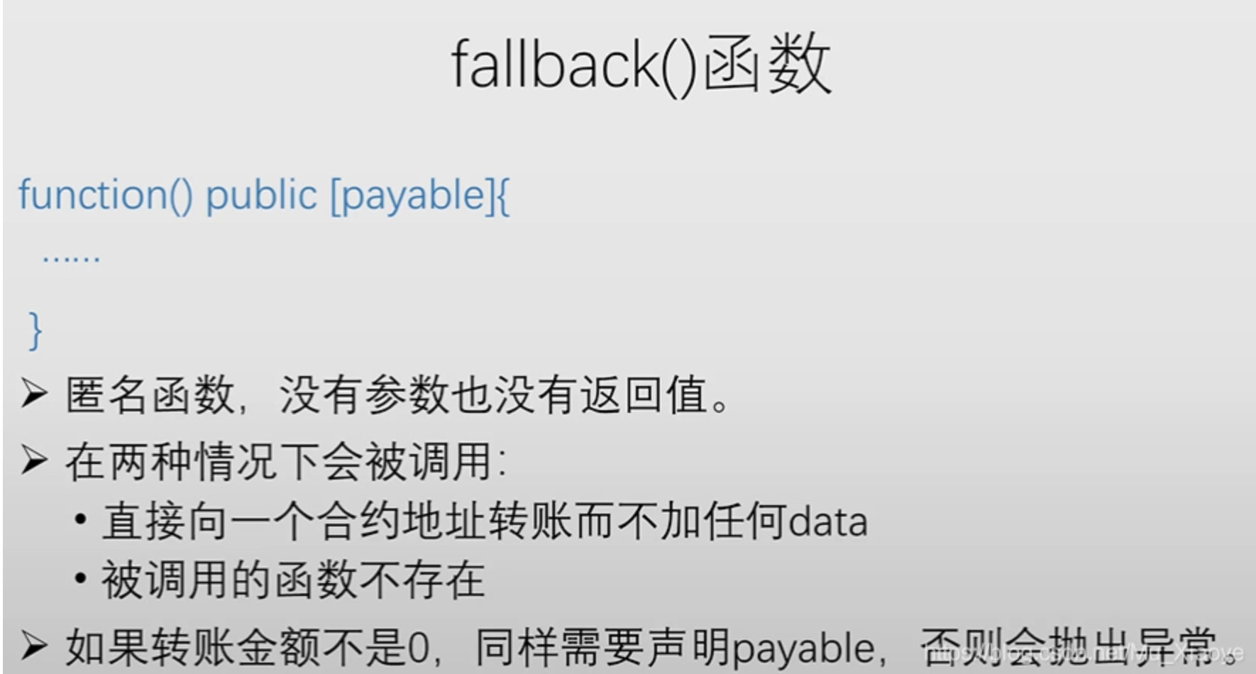无参数无返回值,无函数名,fallback关键字并没有出现在函数名里面。调用合约的时候,A调用B合约,要在转账交易的data域说明调用的是合约B中的哪个函数,如果A给B转了一笔钱,没有说明调用的是哪个函数,也就是data域是空的,这个时候缺省的就是调用这个fallback函数,这也是为什么叫fallback函数,因为没有别的函数可以调用了,就只能调用他。还有一种情况是你要调用的函数不存在,在你的data域里你说你要调用这个函数,实际合约当中没有这个函数,也是调用fallback函数,这也是为什么这个函数没有参数也没有返回值。fallback函数也可能需要标注payable关键词,就如果fallback函数需要有接受转账的能力的话是需要写payable,一般情况都是写成payable,如果合约账户没有任何函数标志为payable,包括fallback函数也没有,那么这个合约没有任何能力可以接受外部的转账。如果有人往合约里转钱就会引发异常。