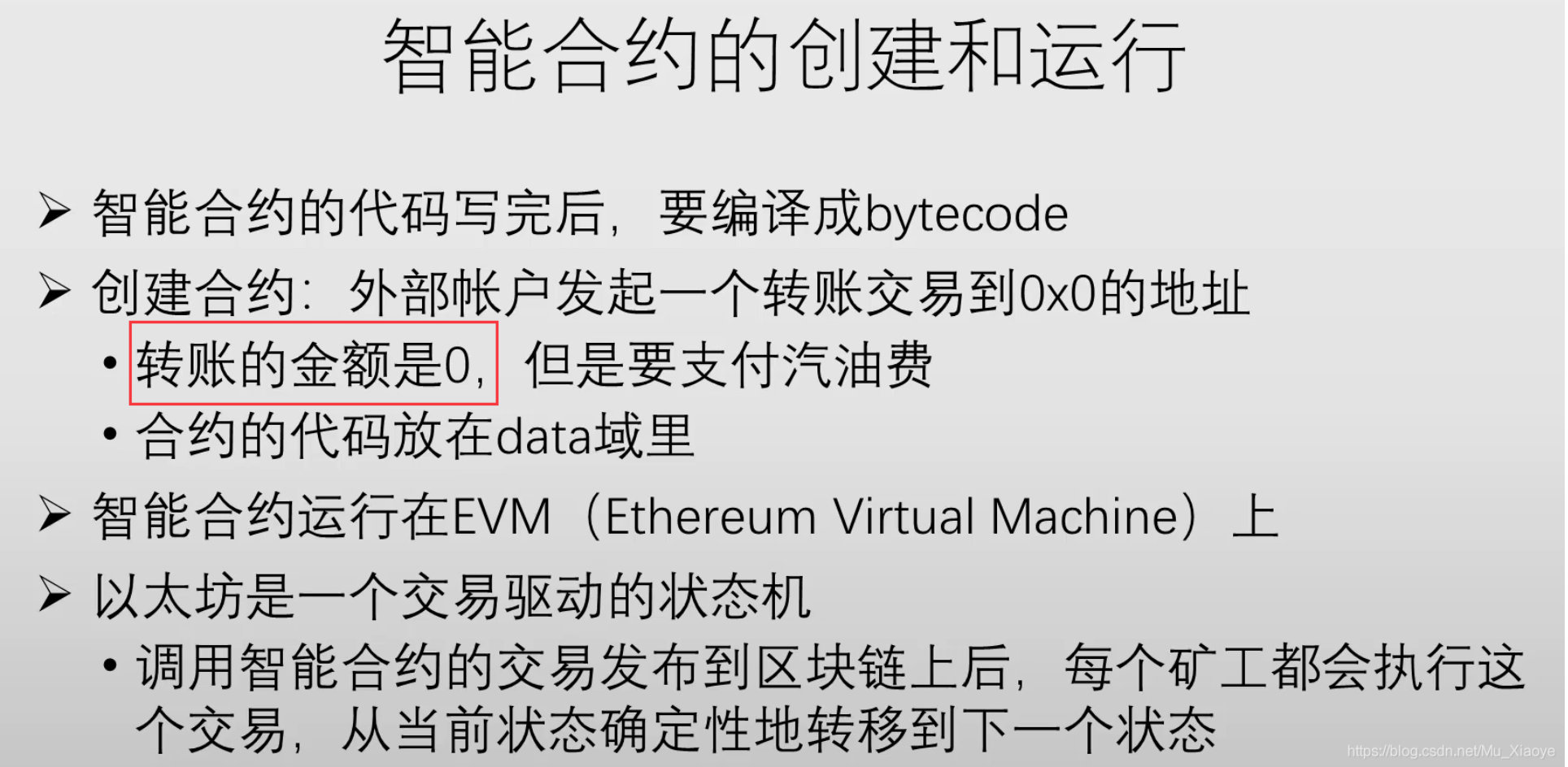 智能合约的创建是由某一个外部的账户发起一笔转账交易,转给0X0地址,然后把要发布的合约代码放到data域里面。Java Virtual Machine是为了增强可一致性,EVM也是类似的思想,通过加一层虚拟机,对智能合约的运行提供一致性的平台,所以EVM又叫world wide compute,EVM的寻址空间是非常大的,是256位的,像如之前讲的uint和signed int就是256位的,普通计算机是64位的。
