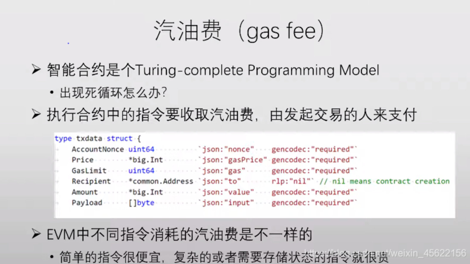 比特币中规定每个区块不能超过1M,是写在协议里不能更改的,比特币的交易是比较简单的,基本上可以用交易的字节数来衡量出这个交易消耗的资源有多少,但是以太坊这么规定是不行的,因为智能合约的逻辑很复杂,有的交易从字节上看可能很小,但是它消耗的资源很大,比如它可能调用别的合约之类的,所以怎么办呢?要根据交易的具体操作来收费,这就是汽油费。