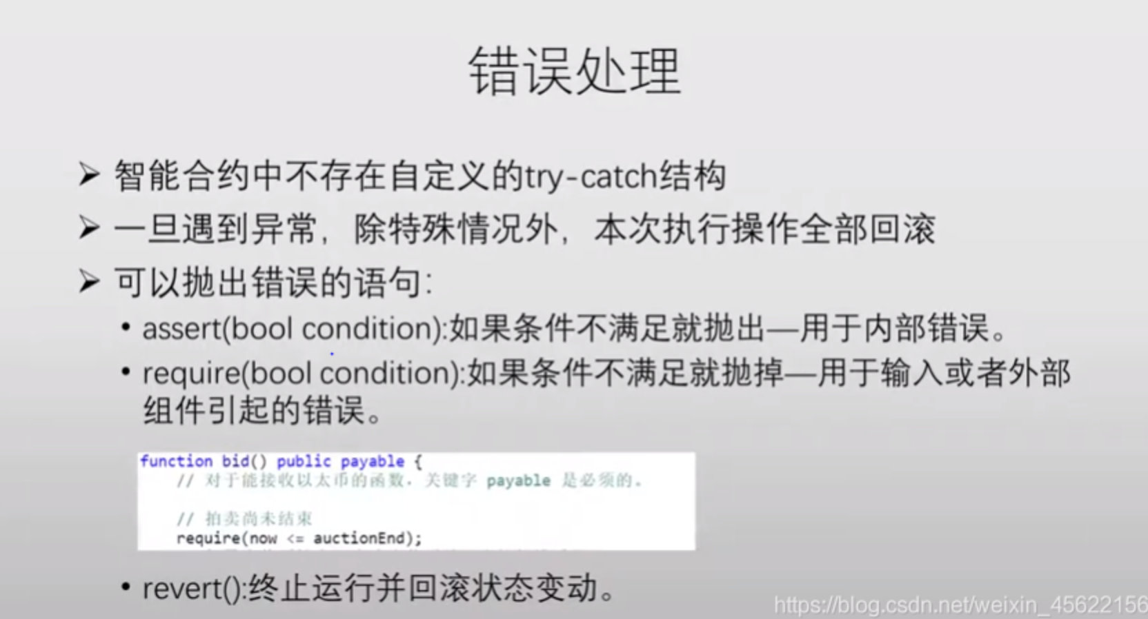 错误处理二:assert语句和require语句,这里两个语句都是用来判断判断某种条件,如果条件不满足的话就会导致抛出异常。assert语句一般来说是用来判断某种内部条件,和c语言中的类似;reuire语句判断某种外部条件,比如说判断函数的输入是否符合要求,下图所给的例子是bid函数里,判断当前时间now是否小于等于拍卖结束时间,如果符合条件,继续执行,不符合,即拍卖时间已经结束了,这个时候就会抛出异常。